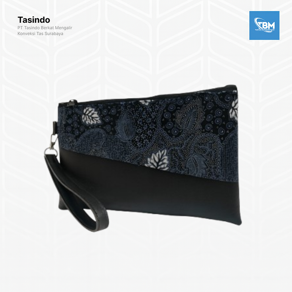 Pouch etnik elegan custom dari Tasindo ini memadukan sentuhan budaya dengan desain modern yang fungsional. Menggunakan bahan kombinasi kulit sintetis hitam dan kain batik motif daun yang khas, pouch ini cocok dijadikan souvenir, gift instansi, ataupun pelengkap gaya formal dan kasual. Dilengkapi tali pegangan tangan dan resleting kuat, pouch ini ideal untuk menyimpan barang-barang kecil seperti alat tulis, makeup, hingga dokumen penting. Produk dari PT Tasindo Berkat Mengalir – Konveksi Tas Surabaya yang terpercaya dalam menghadirkan kualitas dan estetika dalam setiap karya.