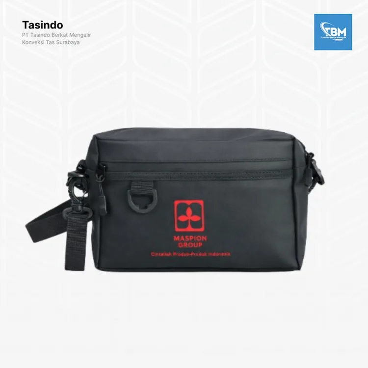 Bagian depan dilengkapi logo bordir/sablon MASPION GROUP yang rapi dan presisi, menciptakan tampilan eksklusif serta memperkuat citra brand perusahaan. Detail ring D dan strap adjustable menambah fungsi sekaligus estetika tas.