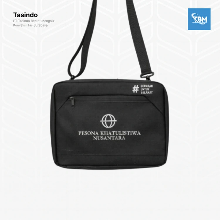 Dilengkapi kompartemen utama yang luas serta saku depan beresleting untuk akses cepat, tas ini ideal digunakan untuk membawa dokumen, gadget, maupun perlengkapan aktivitas harian. Tali selempang adjustable memastikan kenyamanan saat digunakan sepanjang hari. Aplikasi logo Pesona Khatulistiwa Nusantara dan tagline kampanye dicetak rapi, memperkuat identitas brand dengan tampilan yang eksklusif.